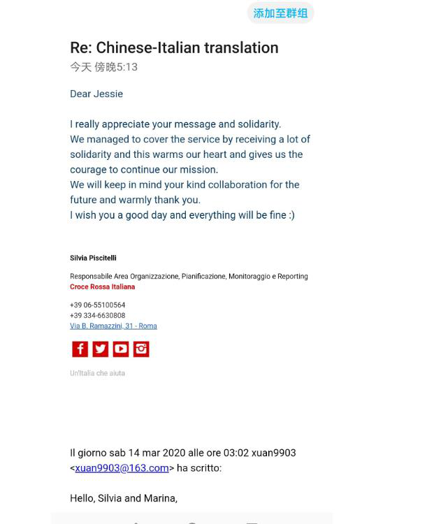 中國(guó)抗疫醫(yī)療專家組當(dāng)?shù)貢r(shí)間12日晚(中國(guó)時(shí)間13日清晨)抵達(dá)意大利首都羅馬。羅馬紅十字會(huì)緊急征招中文-意大利語(yǔ)譯員,協(xié)助中國(guó)專家組完成和意大利方面的溝通工作。迪普勒積極調(diào)動(dòng)譯員資源,為中意共同抗擊新冠疫情的合作積極貢獻(xiàn)了自己的一份力量。在肆虐的病毒面前,沒(méi)有膚色,沒(méi)有國(guó)籍,沒(méi)有文化和價(jià)值觀差異,每個(gè)人都是一個(gè)鮮活的生命,其健康、安全和生存的權(quán)利都值得尊重,值得我們?yōu)橹Α?/p>